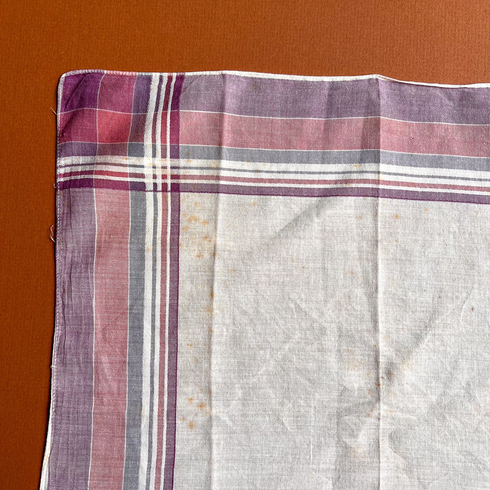 Vintage handkerchief is composed of a pale cream background with a purple plaid border. The plaid border is made of various shades of purple. Machine sewn edges. Only one previous owner from San Francisco, CA. Please note: there are some marks on the fabric. Light weight. No label. Handkerchief is in great condition.