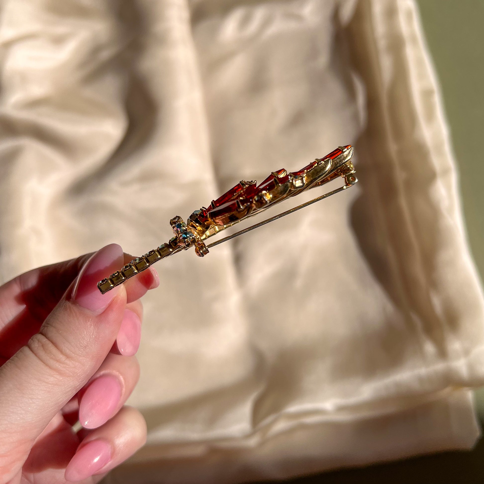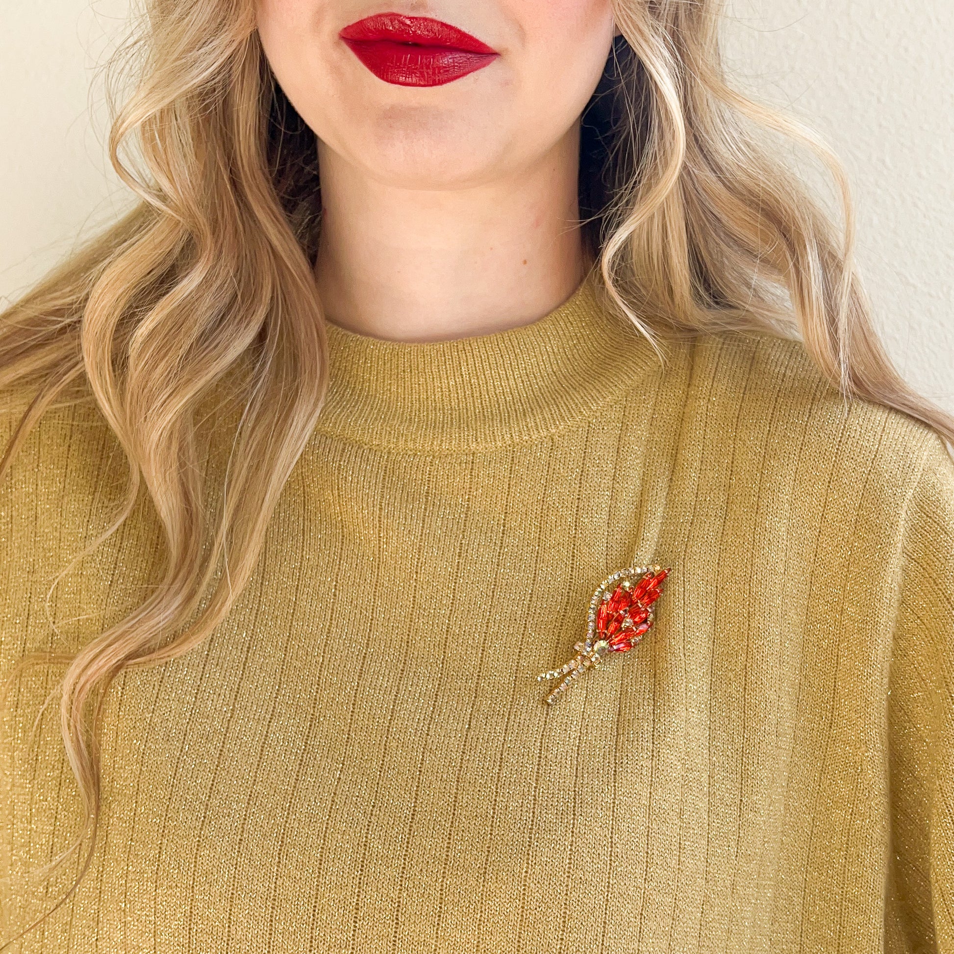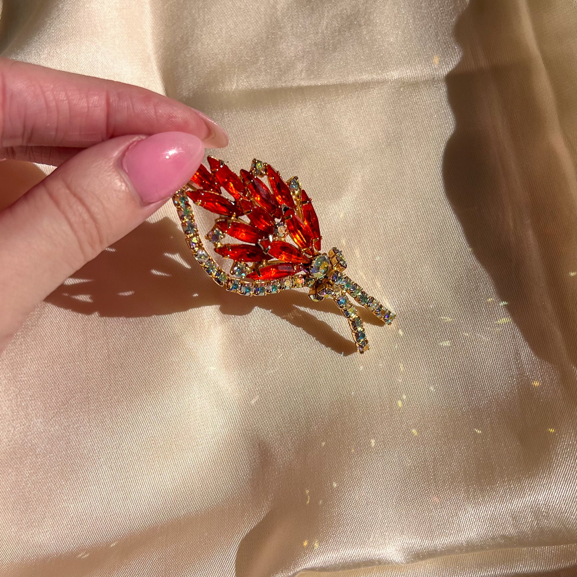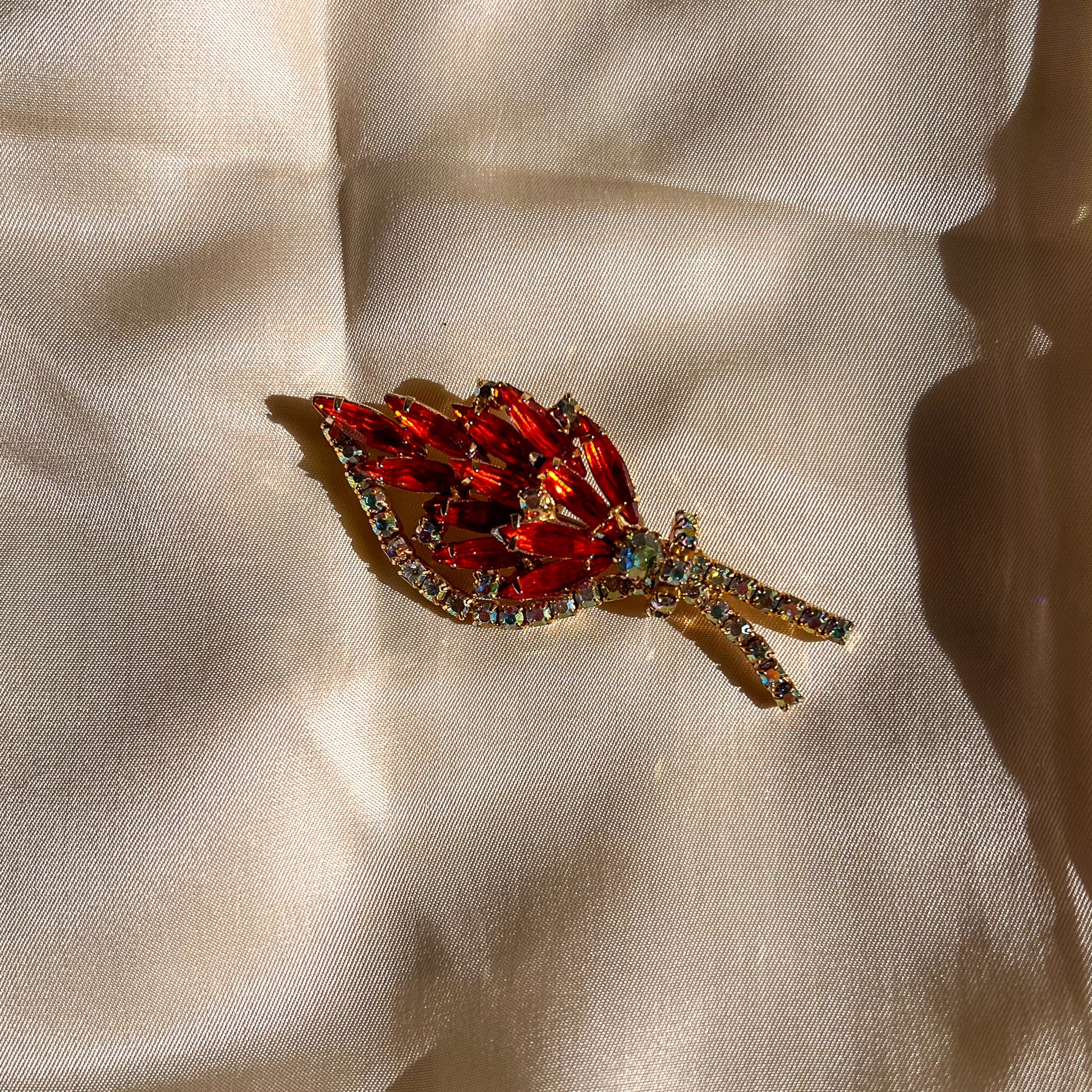 Vintage brooch is composed of a gold-tone metal base with iridescent rhinestones and teardrop-shaped orange gemstones. The stones catch the light beautifully. Only one previous owner from Portland, OR. Light weight. No label. Brooch is in excellent condition. Jewelry has been freshly cleaned and is ready to wear!