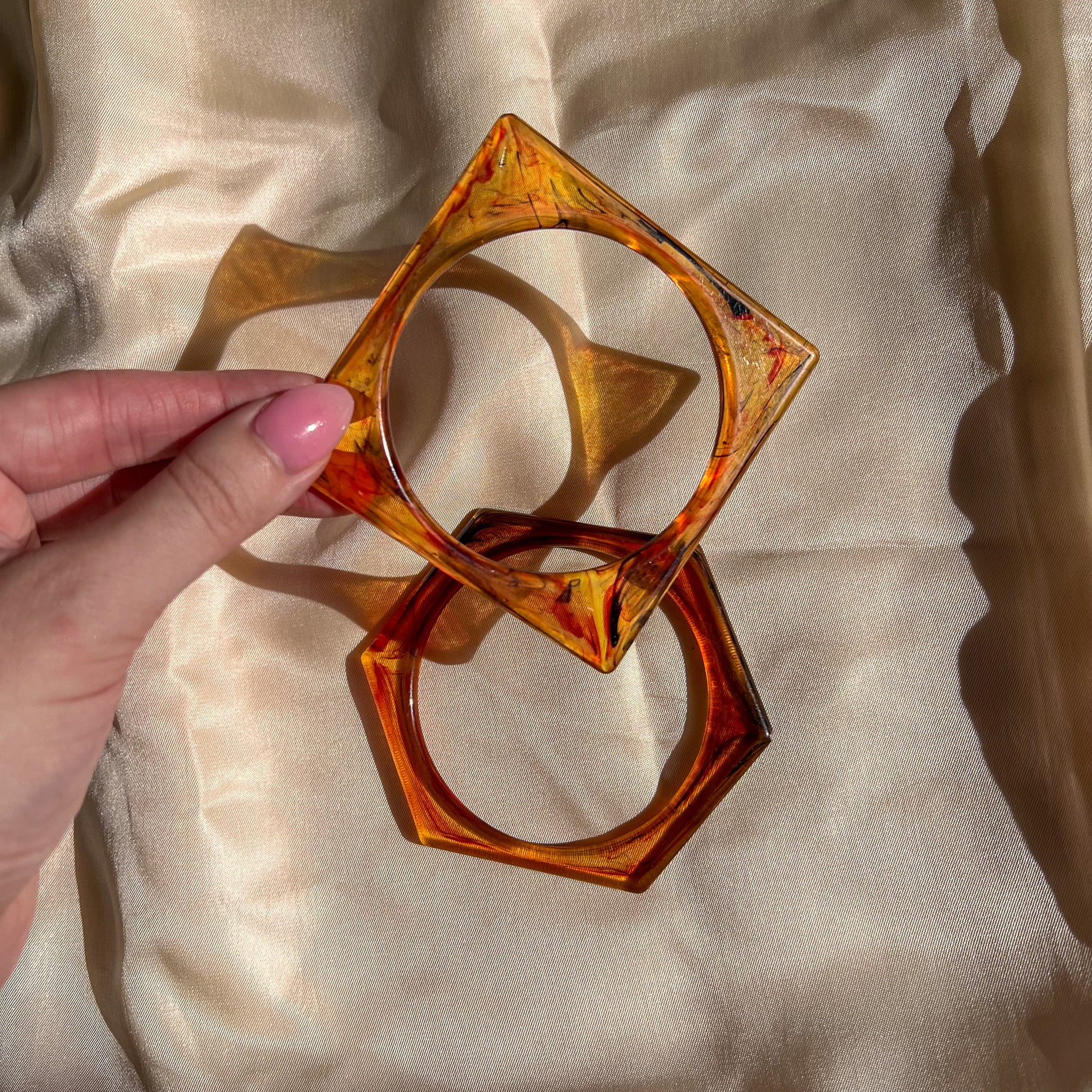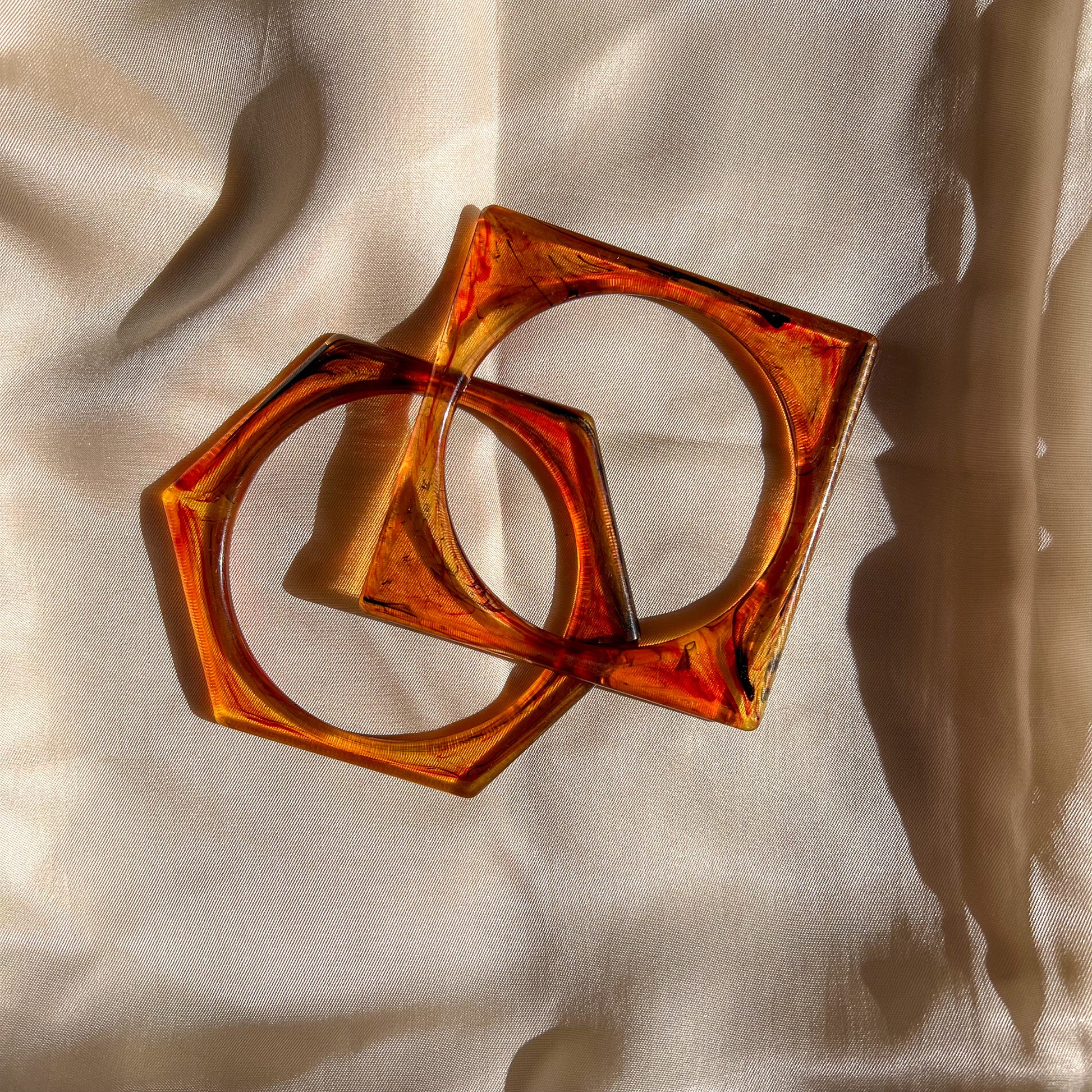 Vintage jewelry set is composed of 2 lucite bracelets. One bracelet is square-shaped and the other is hexagon-shaped. Material is composed of a light brown color that's mixed with red and black to create a tortoise shell material. Light weight. No label. Bracelets are in excellent condition. Jewelry has been freshly cleaned and is ready to wear!
