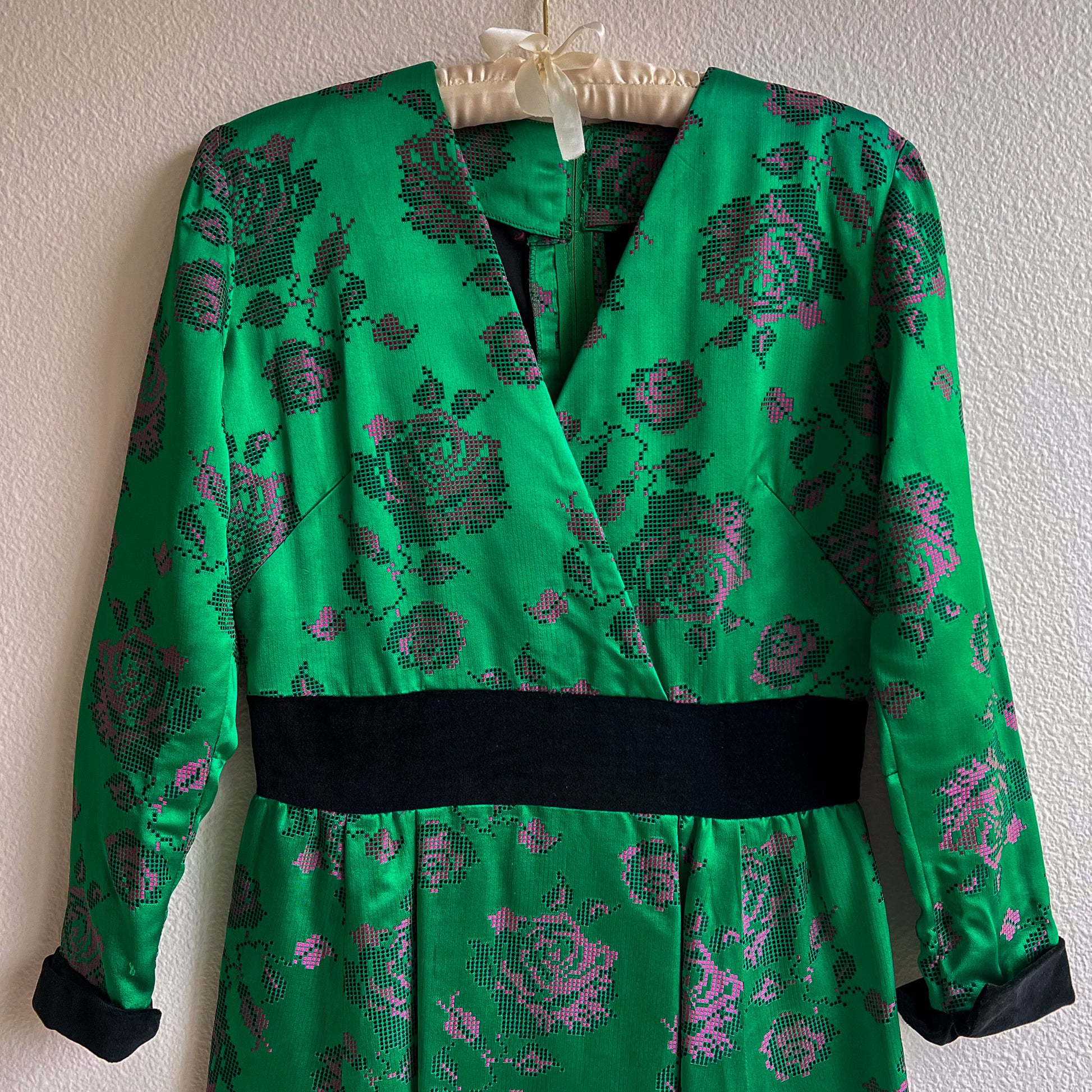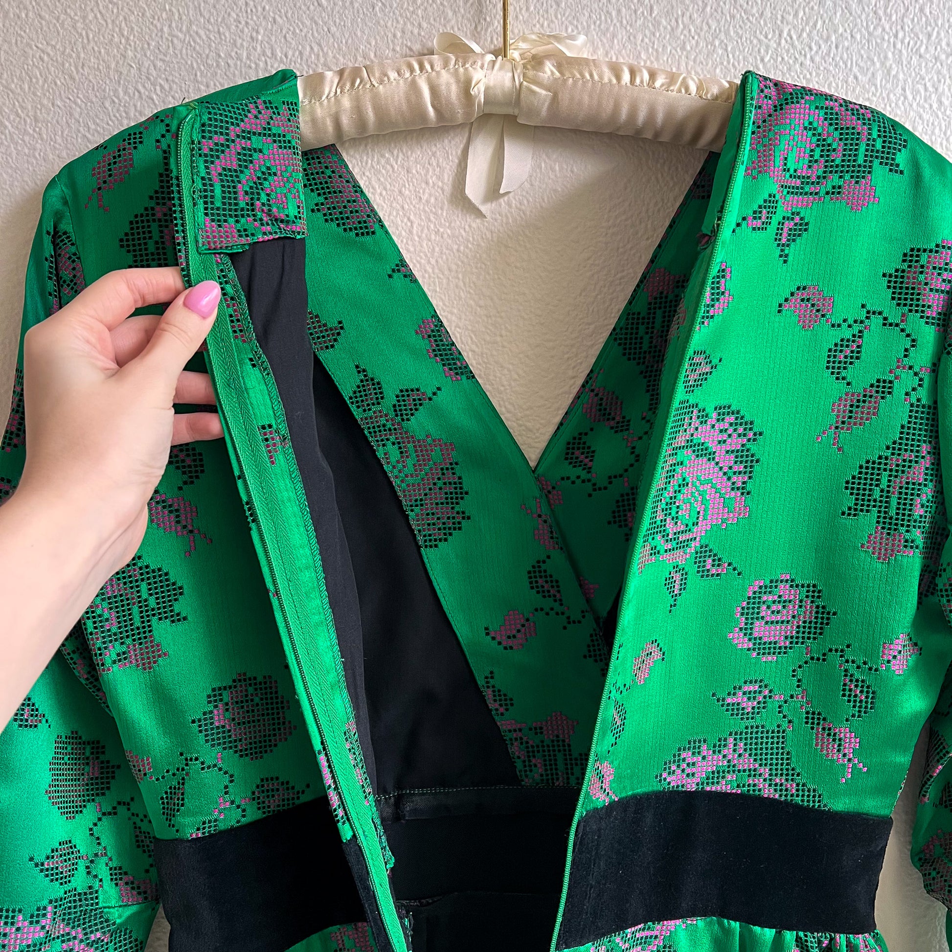 Vintage dress features a V-shaped neckline with long sleeves. Fabric is composed of an emerald-green silk jacquard with pink and black rose pattern design. Black velvet trim at the waist and cuffs. Original zipper in the back. Black lining on the bodice and skirt. Medium weight. No label. No stretch. Fabric content is silk. Dress is in excellent condition. Freshly cleaned and ready to wear!