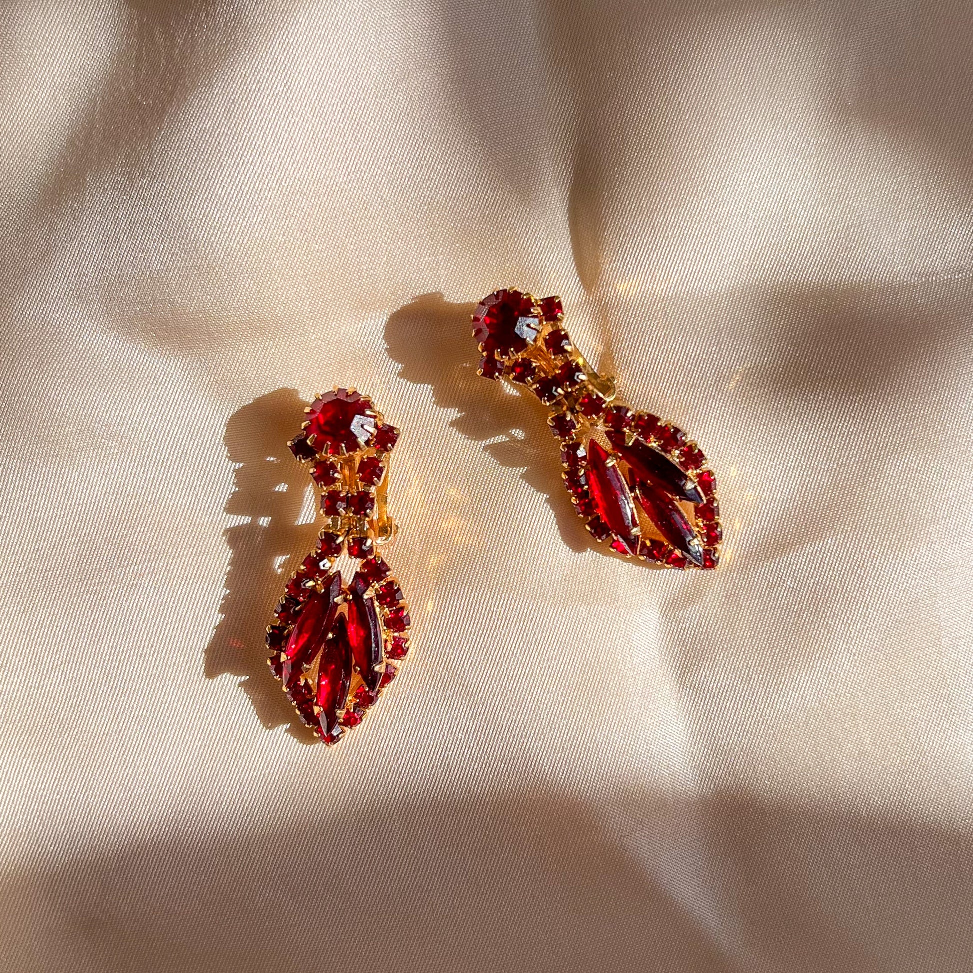 Vintage clip-on earrings are composed of gold-tone metal with ruby red rhinestones. Circular stone at the top, 3 teardrop shaped stones in the middle, and small rhinestones surrounding the sides. Light weight. No label. Earrings are in excellent condition. Jewelry has been freshly cleaned and is ready to wear!