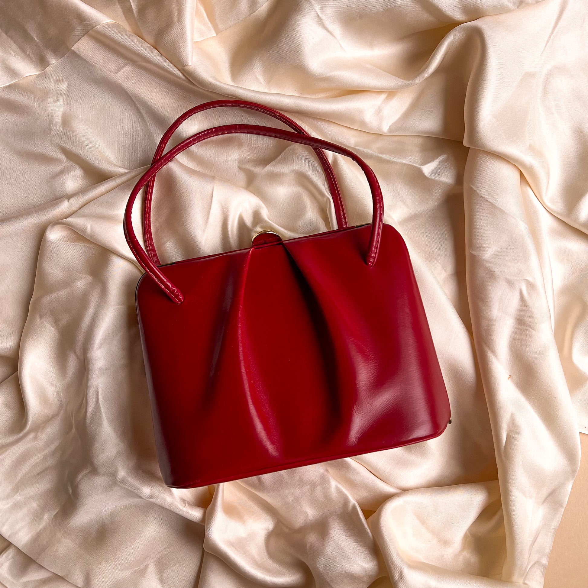 Vintage handbag features a structured design of red leather and polished gold-tone metal. Two thin straps compose the handle. Snap clasp closure. Black silk lining with a zippered pocket divider. Please note: there's some wear on the leather. Please check photos provided. Medium weight. No label. Fabric content is leather and silk. Handbag is in great condition. Leather has been freshly cleaned and conditioned!