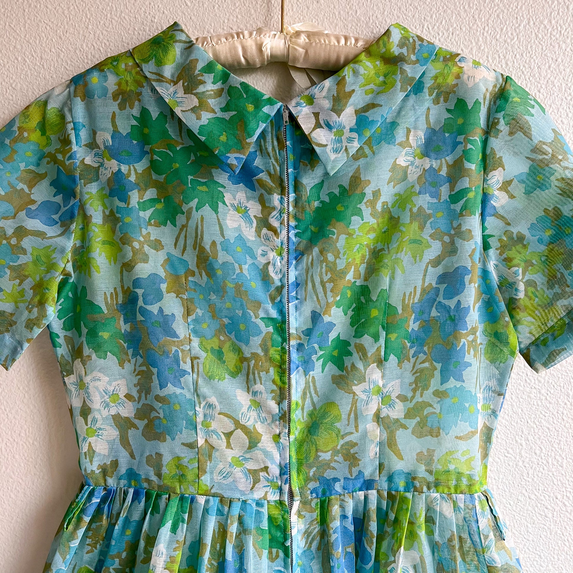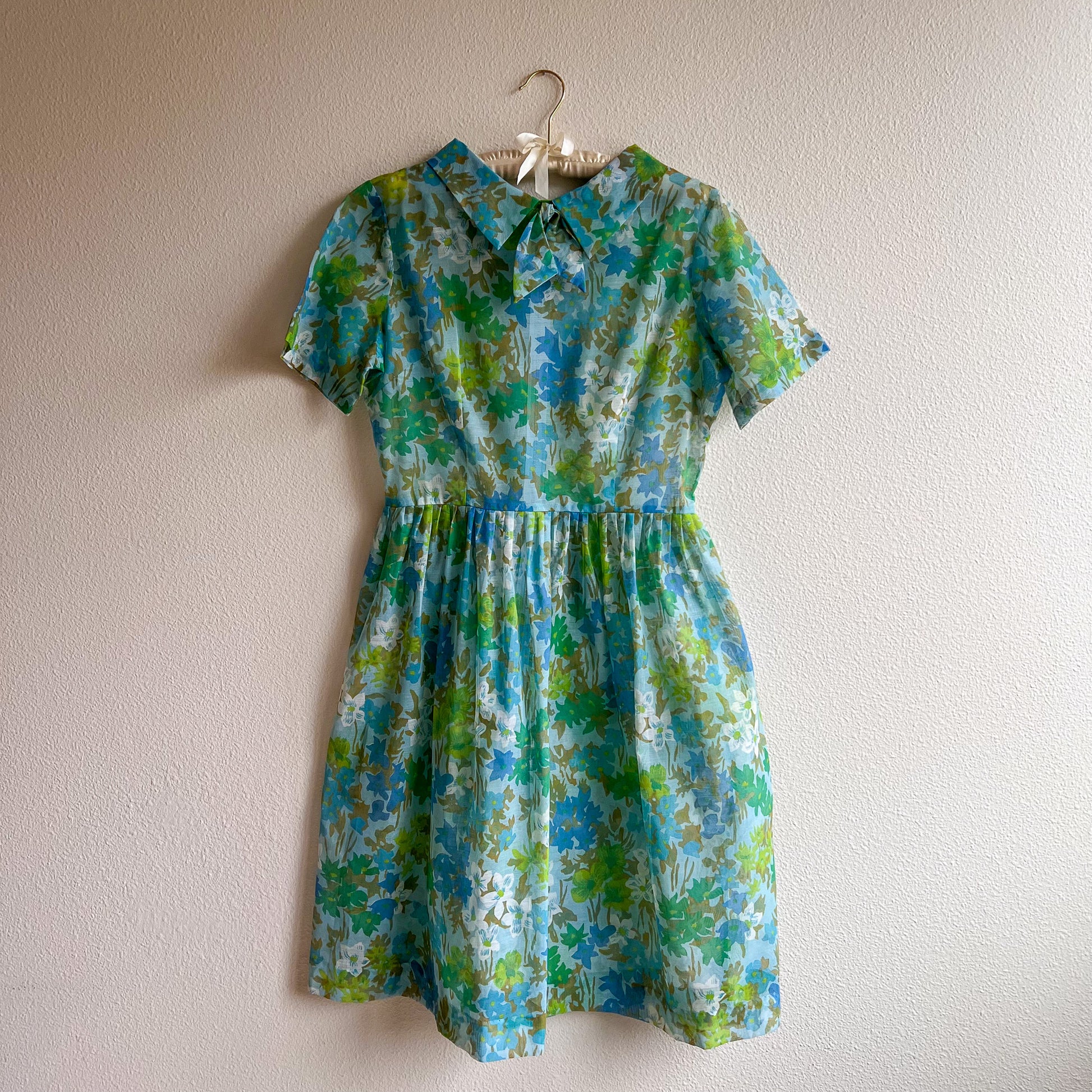 Coming in hot: playful prints and sunny silhouettes! Vintage dress features a collared neckline with short sleeves. A line silhouette. Fabric is composed of a sky blue background with blue, green, and white floral pattern design. Small bow sewn to the collar. Pleated details at the waist. Original metal zipper in the back. Dress is sheer. Light weight. No label. No stretch. Fabric content is cotton. Dress is in excellent condition. Freshly cleaned and ready to wear!