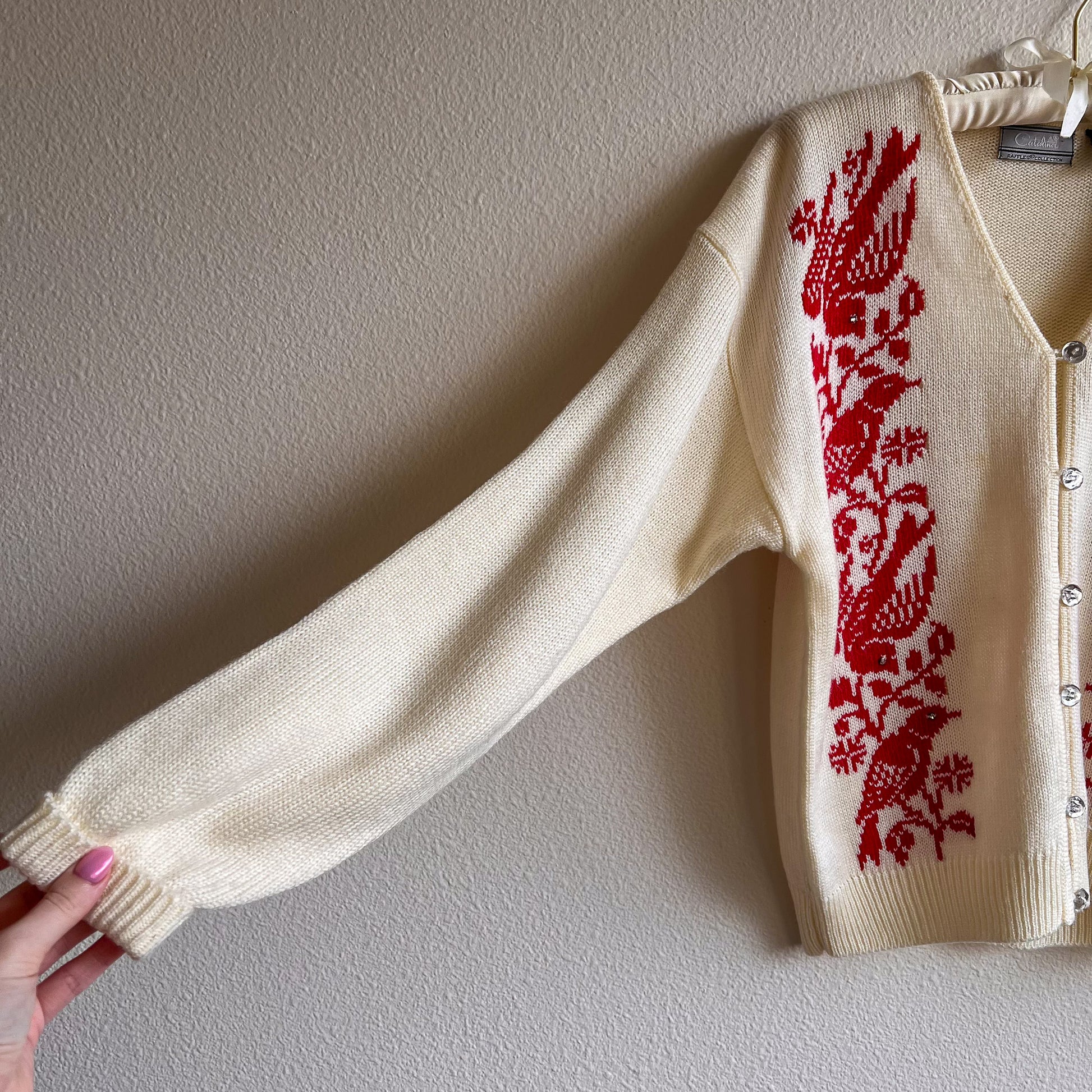 Vintage cardigan features a V-shaped neckline with long sleeves. Fabric is composed of an ivory-colored knit with red details. A beautiful red bird and nature design is displayed on the front. Small rhinestones compose the birds' eyes. Plastic faceted crystal-like buttons down the front. Cardigan is not lined. Medium weight. Label is Catalina. About an inch of extra stretch. Fabric content is 100% acrylic. Cardigan is in excellent condition. Freshly cleaned and ready to wear!