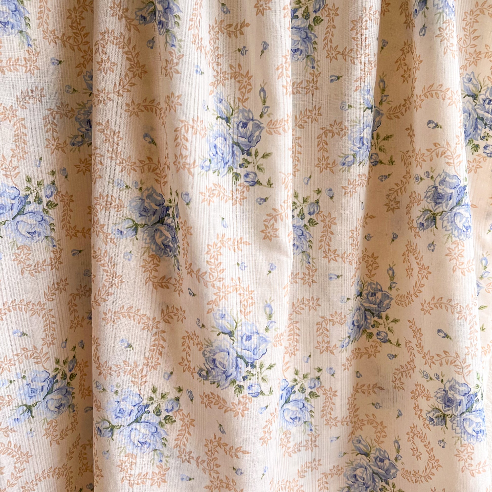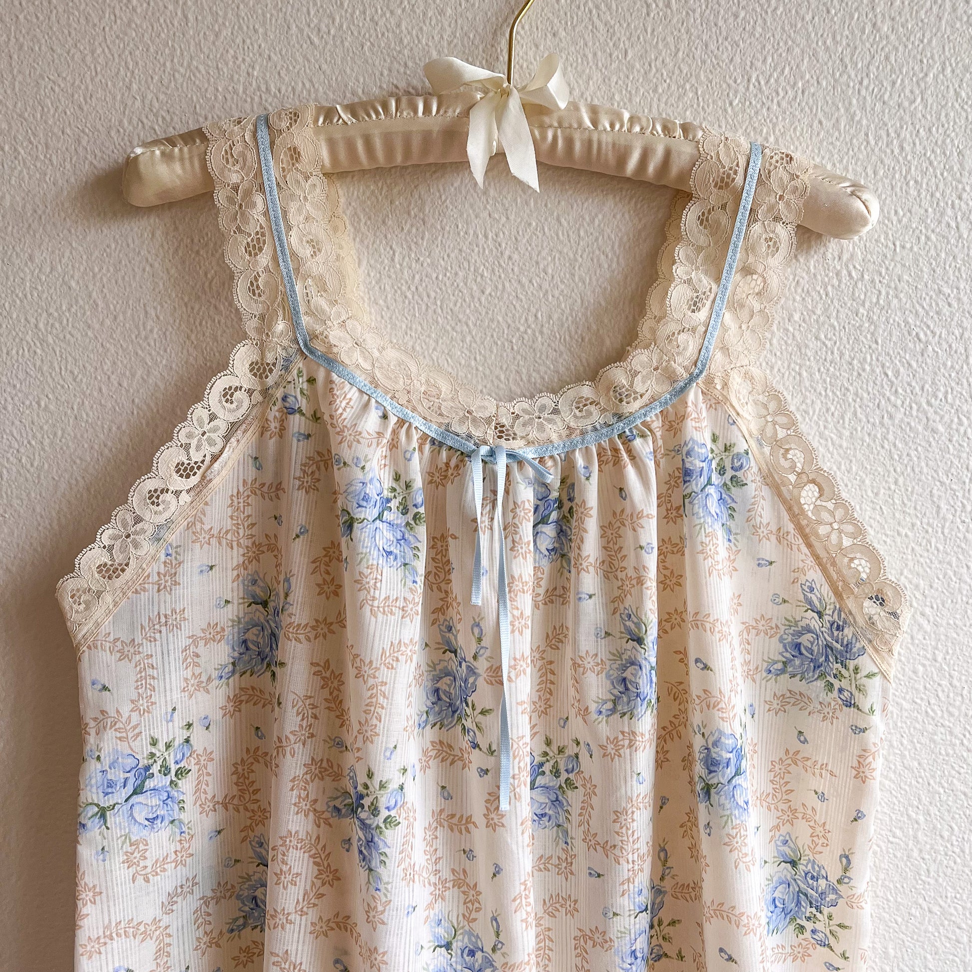 Sheer, airy perfection! Vintage sleeveless dress features a scoop neckline. Shift silhouette. Fabric is composed of an ivory background with sheer stripes. The pattern design is a mix of tan dainty florals with pale blue roses. Ivory lace and blue ribbon trim along the collar and straps. Ruffled hemline. Pullover style. Dress is sheer. Light weight. No label. No stretch. Fabric content is cotton and nylon. Dress is in excellent condition. Freshly cleaned and ready to wear!