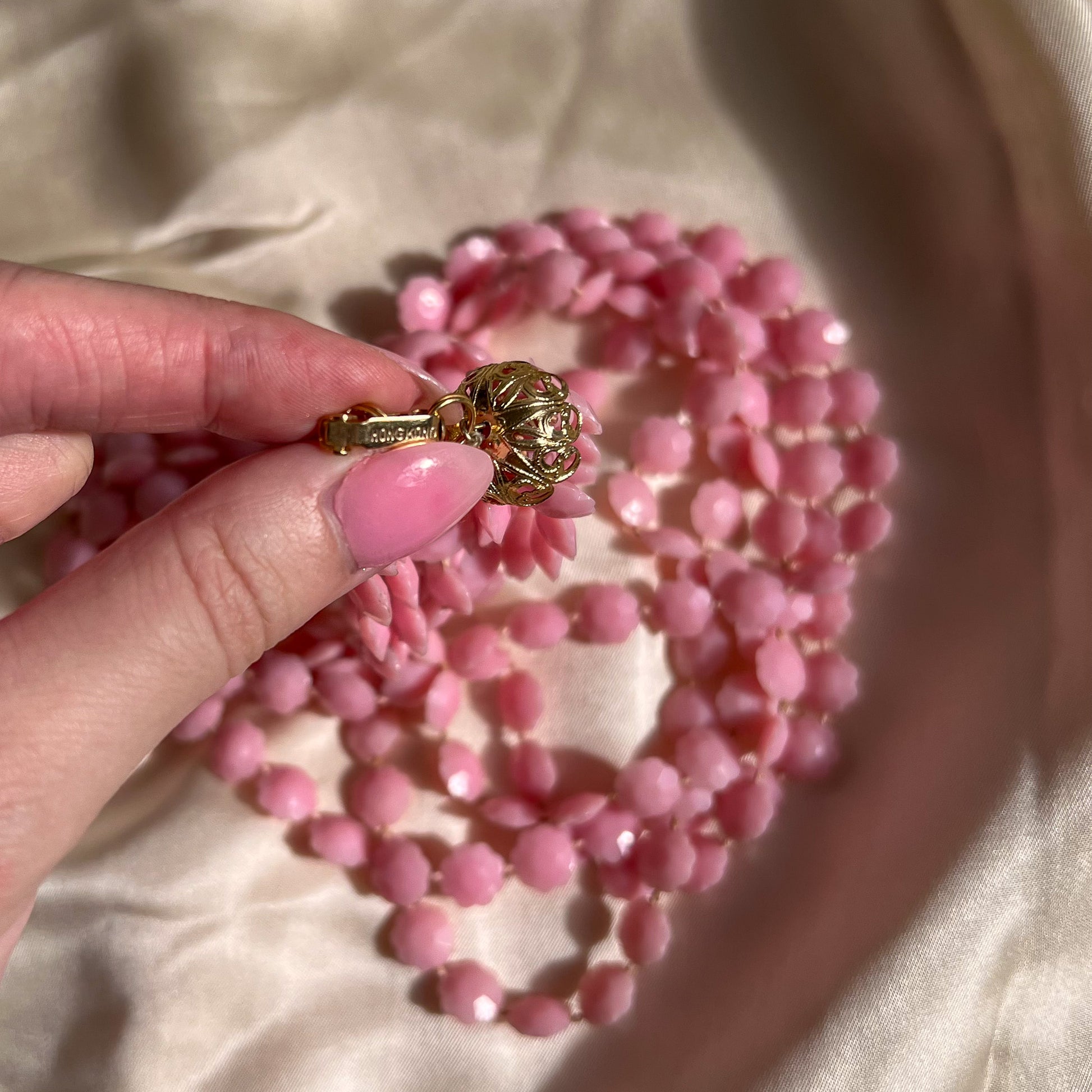 Vintage necklace features 5-strands made of pale pink plastic beads. Gold-tone metal composes the fold-over clasp closure. Light weight. No label, except "Hong Kong." No stretch. Necklace is in excellent condition. Jewelry has been freshly cleaned and is ready to wear!