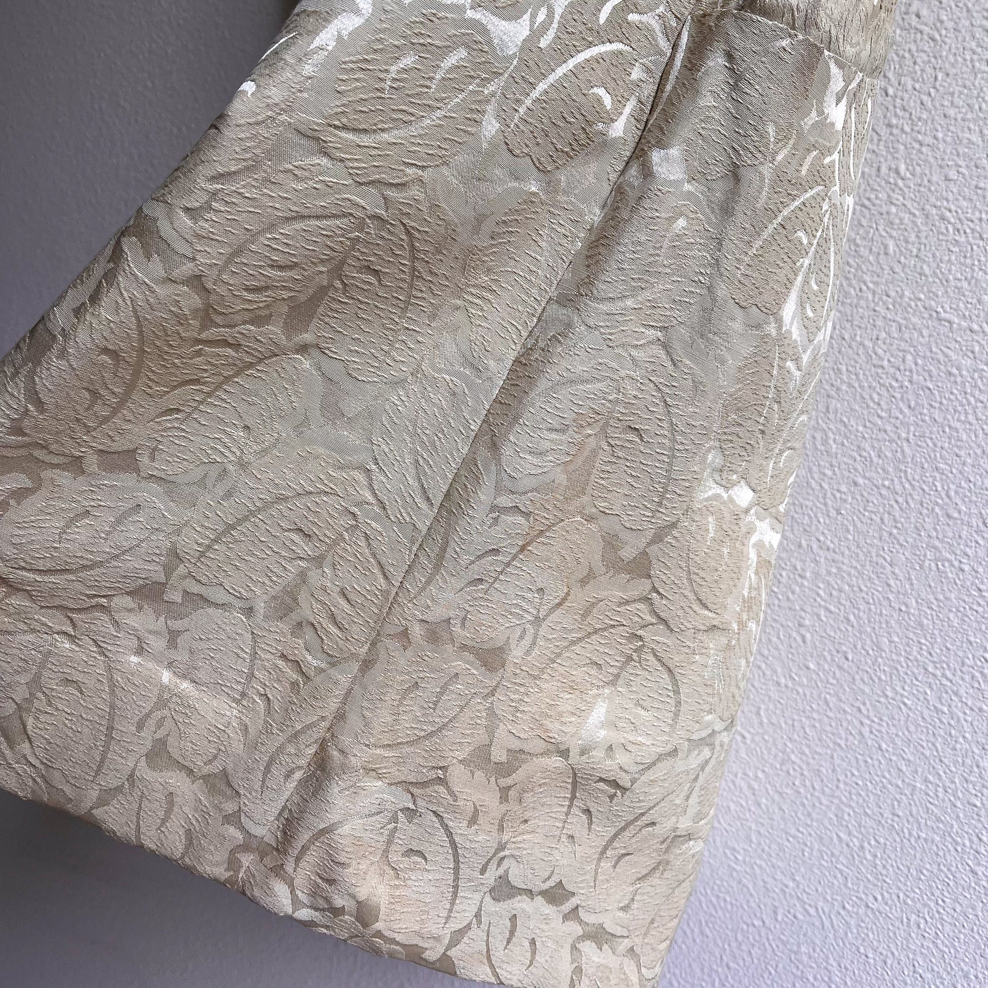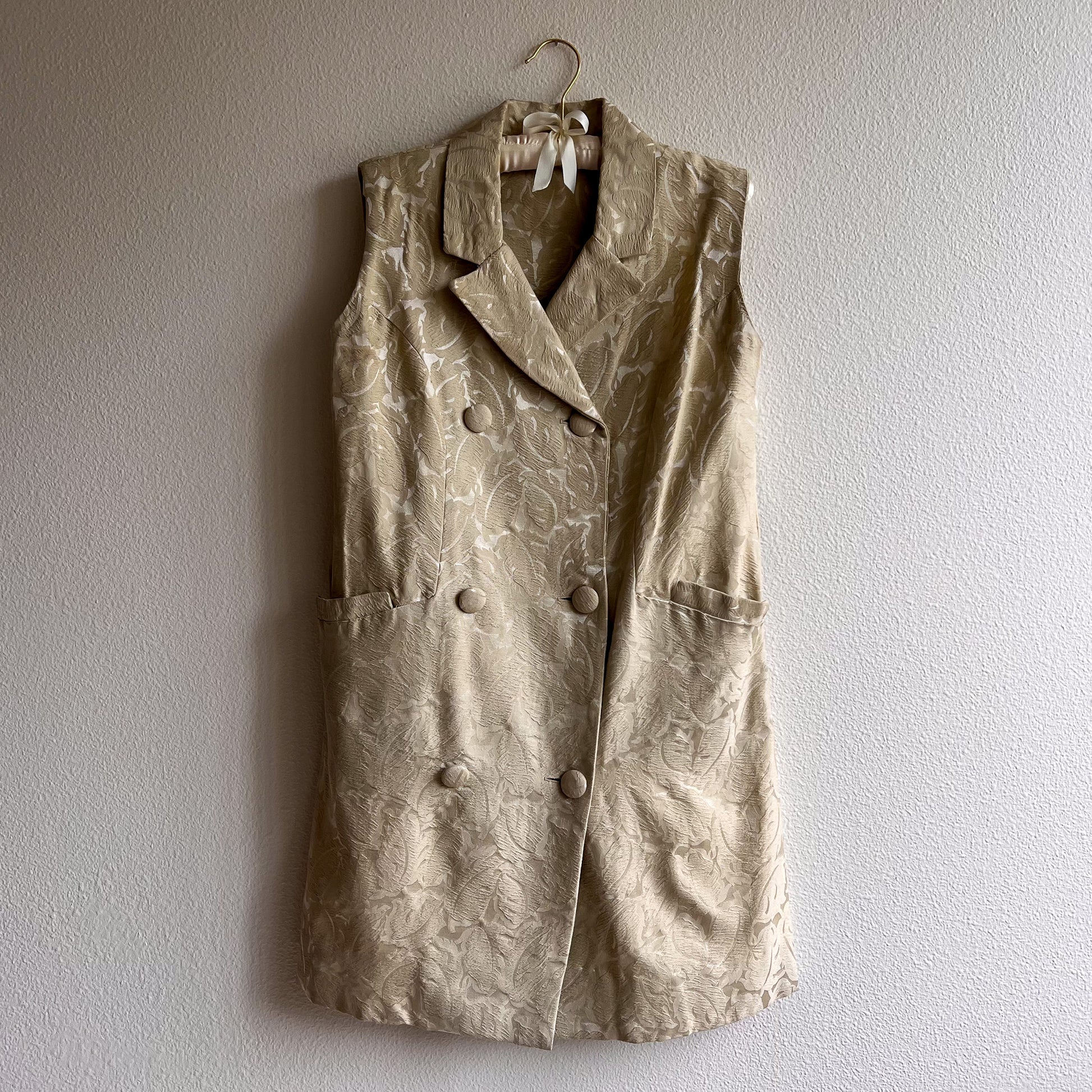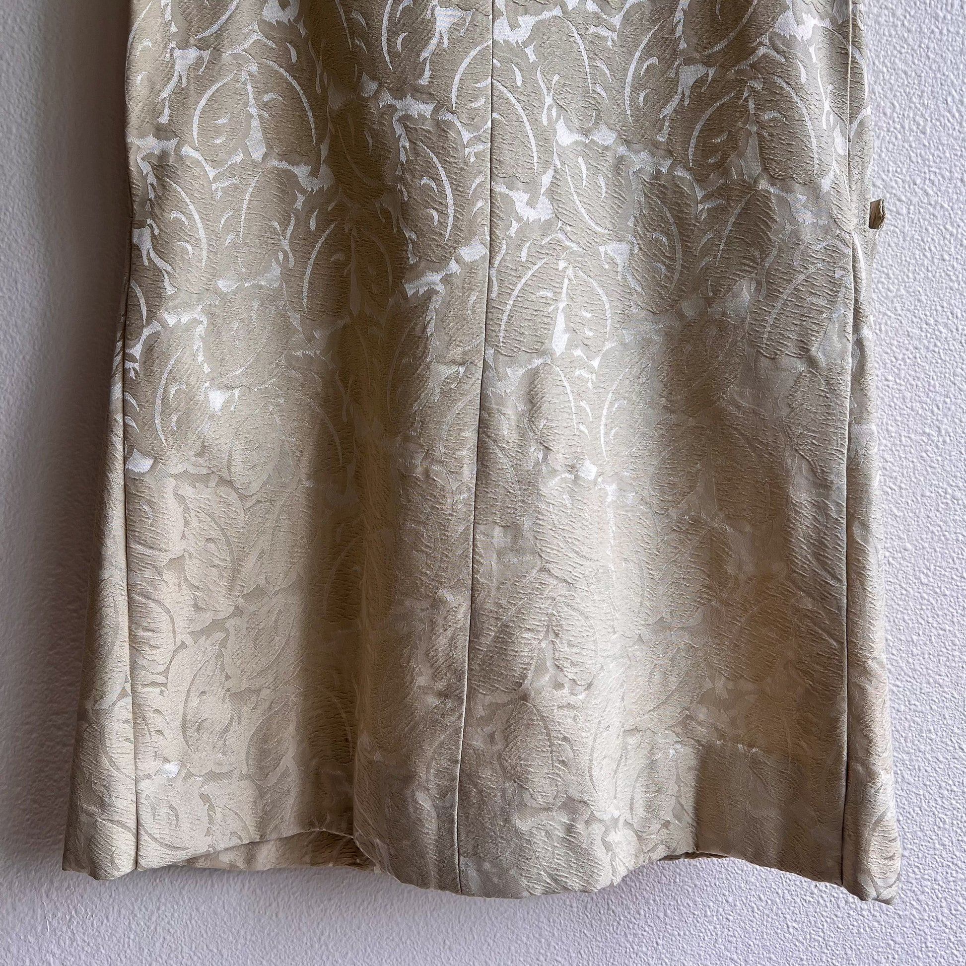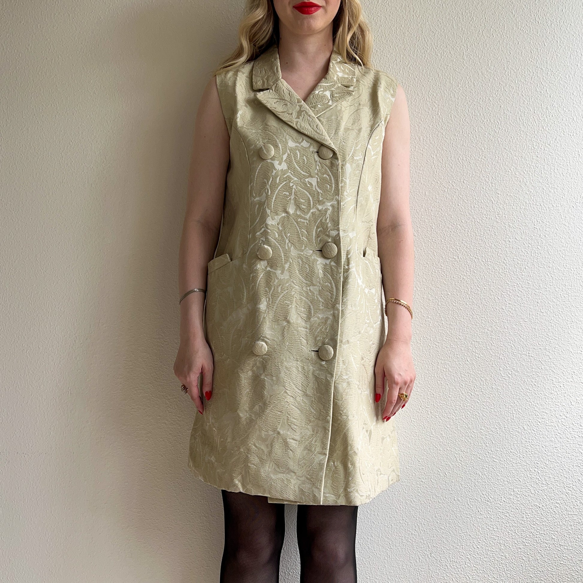 Add just enough structure to every celebration! Vintage sleeveless dress features a collared neckline. Double-breasted silhouette with 2 hidden snap closures and 3 large fabric-covered buttons. Fabric is composed of a muted green silk brocade with a subtle leaf pattern design. Pockets at the hips. Dress is not lined. Please note: there is a tiny mark on the front. Please check photos provided. Medium weight. No label. No stretch. Fabric content is silk. Dress is in excellent condition. Freshly cleaned and ready to wear!