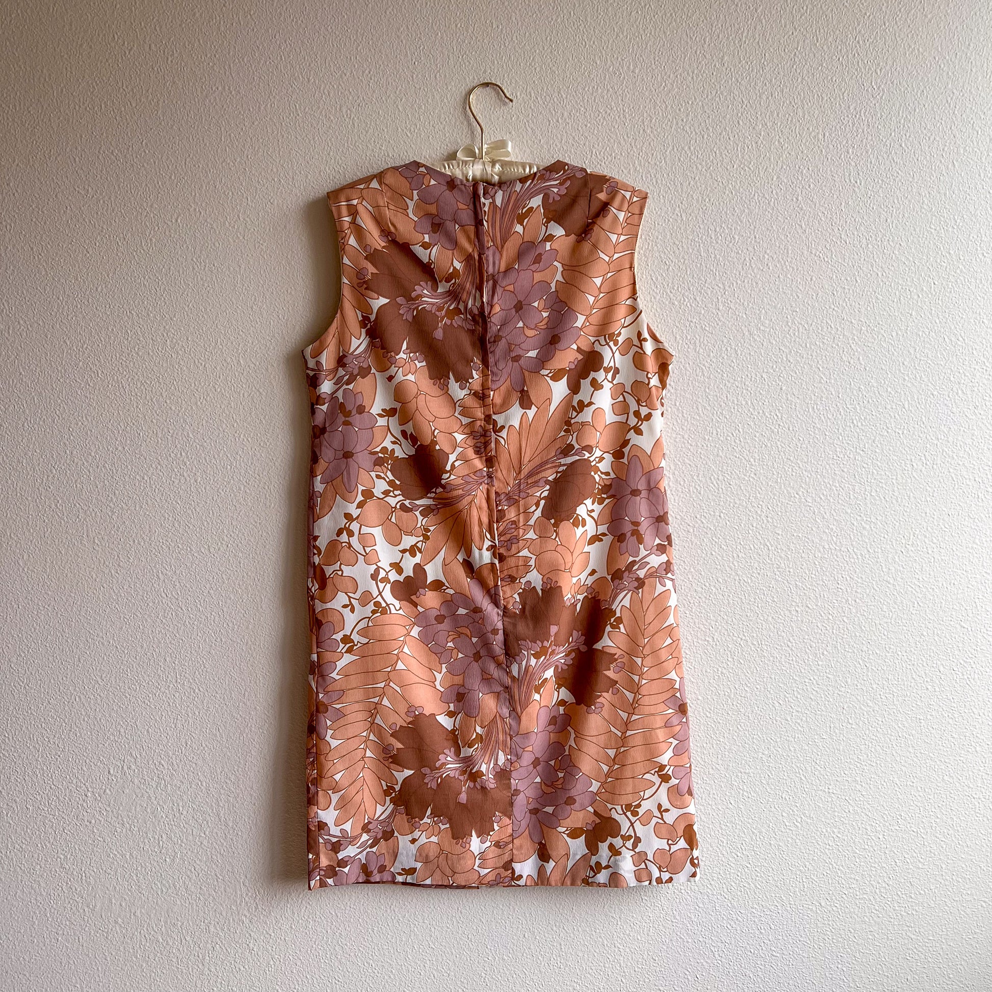Casual is looking as cute as a button! Vintage sleeveless dress features a boat neckline with a shift silhouette. Fabric is composed of a white background with a taupe, tan, and brown floral pattern design. Dress is lined in cotton. Original zipper on the back. Light weight. No label. No stretch. Fabric content is cotton and polyester. Dress is in excellent condition. Freshly cleaned and ready to wear!