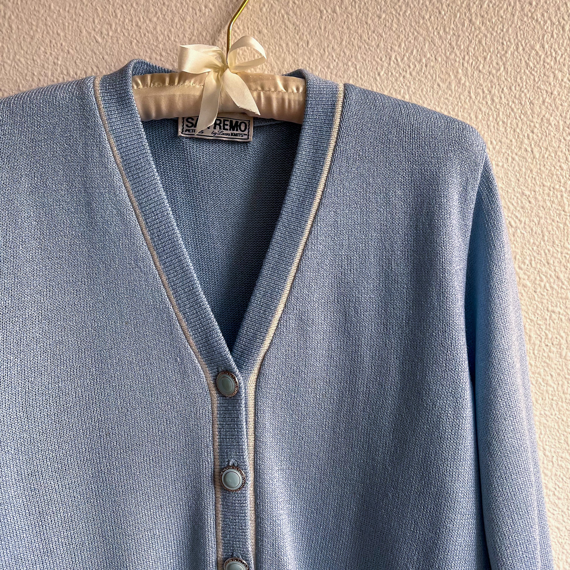 Take a casual stroll in the prettiest blue! Vintage cardigan features a V-shaped neckline with long sleeves. Silver buttons with blue enamel down the front. Ribbed knit details on the collar, cuffs, and hemline. Fabric is composed of a sky blue knit with a thin white trim. Medium weight. Label is San Remo Petites by Laura Knits. About 1 inch of extra stretch. Fabric content is 90% acrylic and 10% nylon. Cardigan is in excellent condition. Freshly cleaned and ready to wear!
