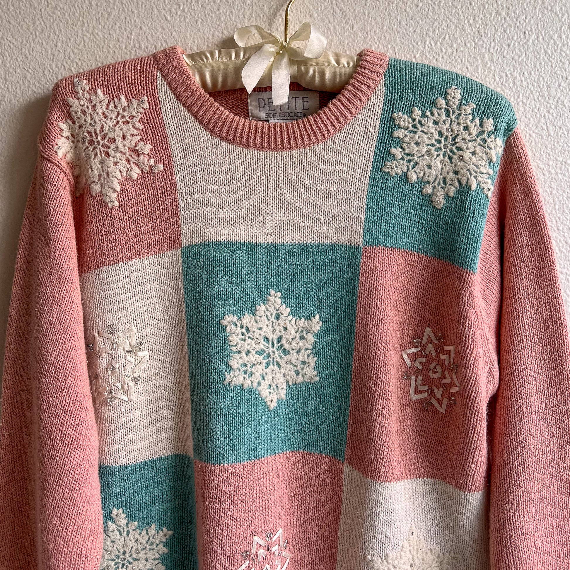 Vintage sweater features a crew neckline with long sleeves. Fabric is composed of a muted blush knit mixed with white and blue knit squares. Snowflakes are composed of white embroidery as well as white ribbons. Ribbed knit details along the collar, cuffs, and hemline. Sweater is not lined. Pullover style. Heavy weight. Label is Petite Sophisticate. About an inch of extra stretch. Fabric content is 55% ramie and 45% cotton. Sweater is in excellent condition . Freshly cleaned and ready to wear!