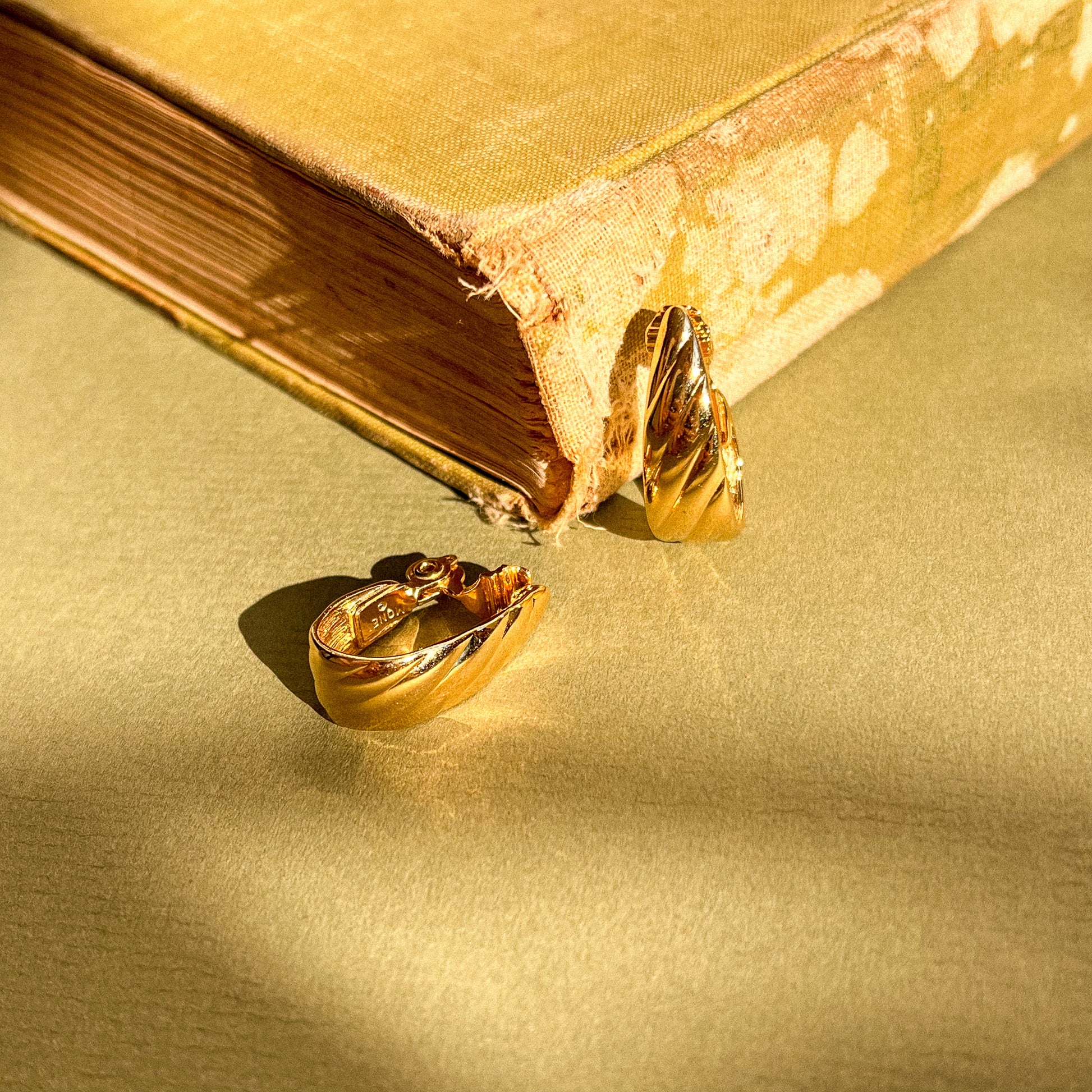 Vintage clip-on earrings are composed of a gold tone hoop. Ribbed details along the teardrop-shaped earrings. Light weight. Label is Monet. Earrings are in excellent condition. Jewelry has been freshly cleaned and is ready to wear!