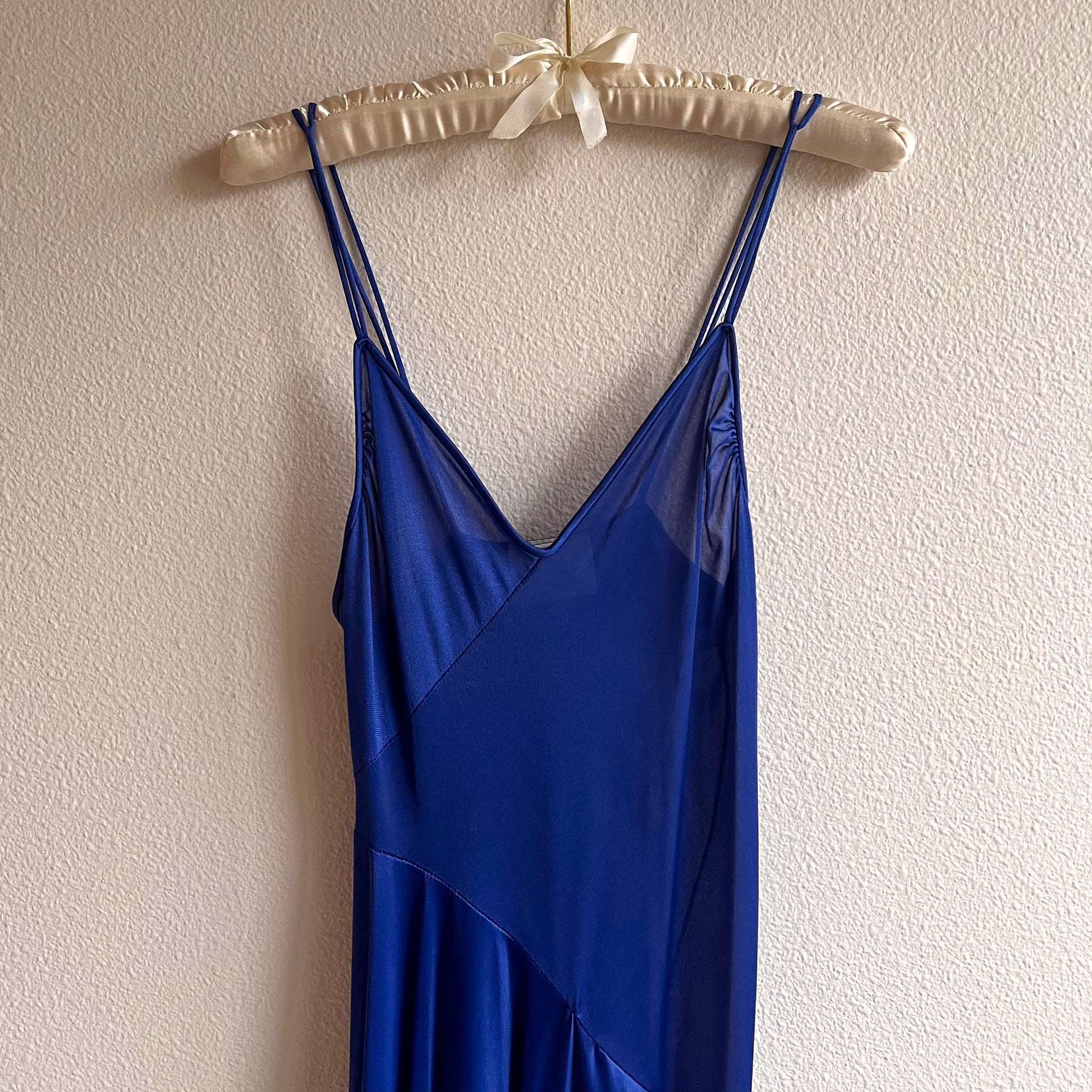 Lounge in glamour! Vintage slip dress features a V-shaped neckline with spaghetti straps. The straps are non-adjustable. A line silhouette. Fabric is composed of a sheer cobalt blue bias cut. High slit on the left side. Light weight. Pullover style. Label is Undercover Wear. Made in USA. About an inch of extra stretch. Fabric content is 100% nylon. Dress is in excellent condition. Freshly cleaned and ready to wear!