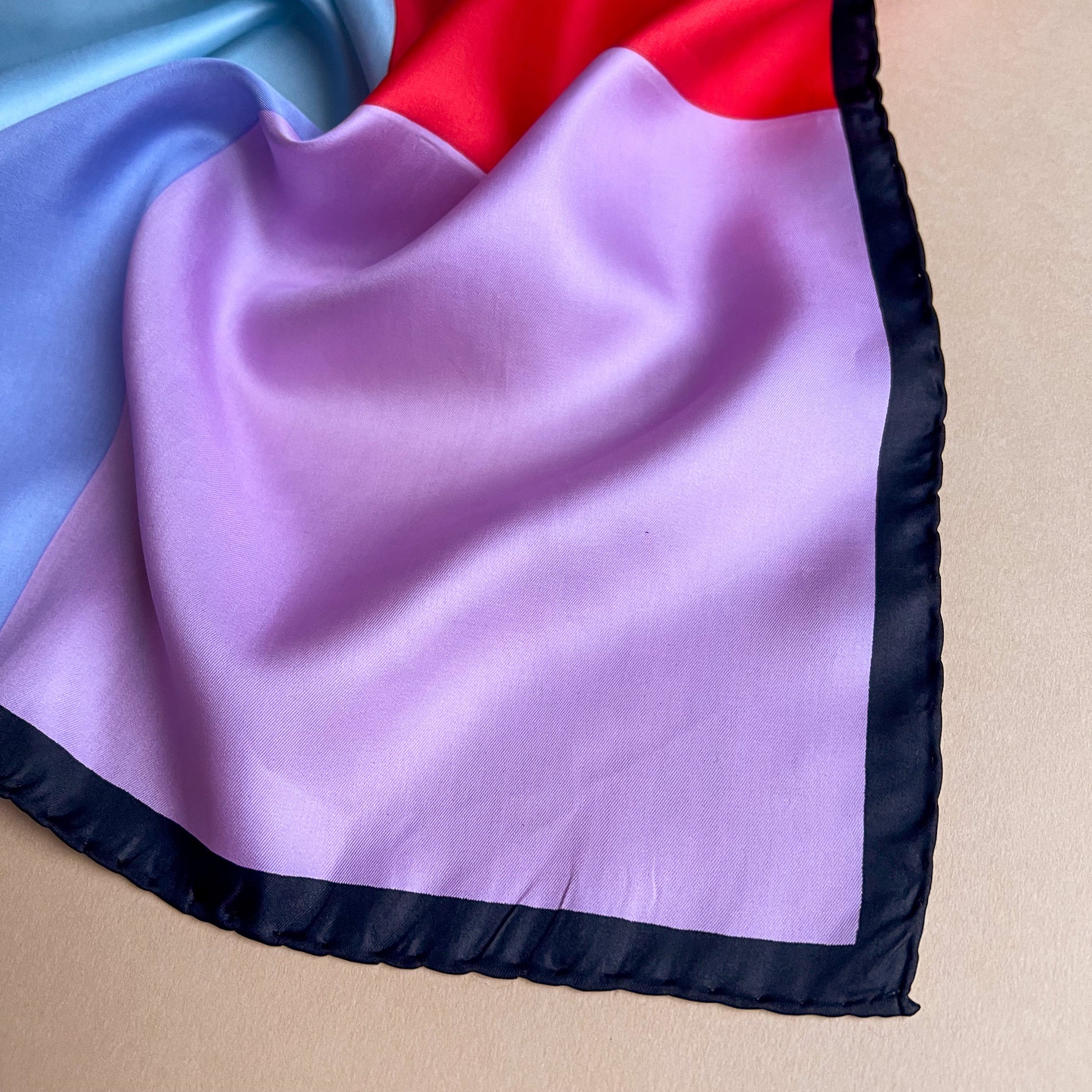 Vintage scarf features a thin black border that contains four quadrants of colors: red, pink, purple, and blue. Hand rolled sewn edges. Light weight. No label. Fabric content is silk. Scarf is in excellent condition.