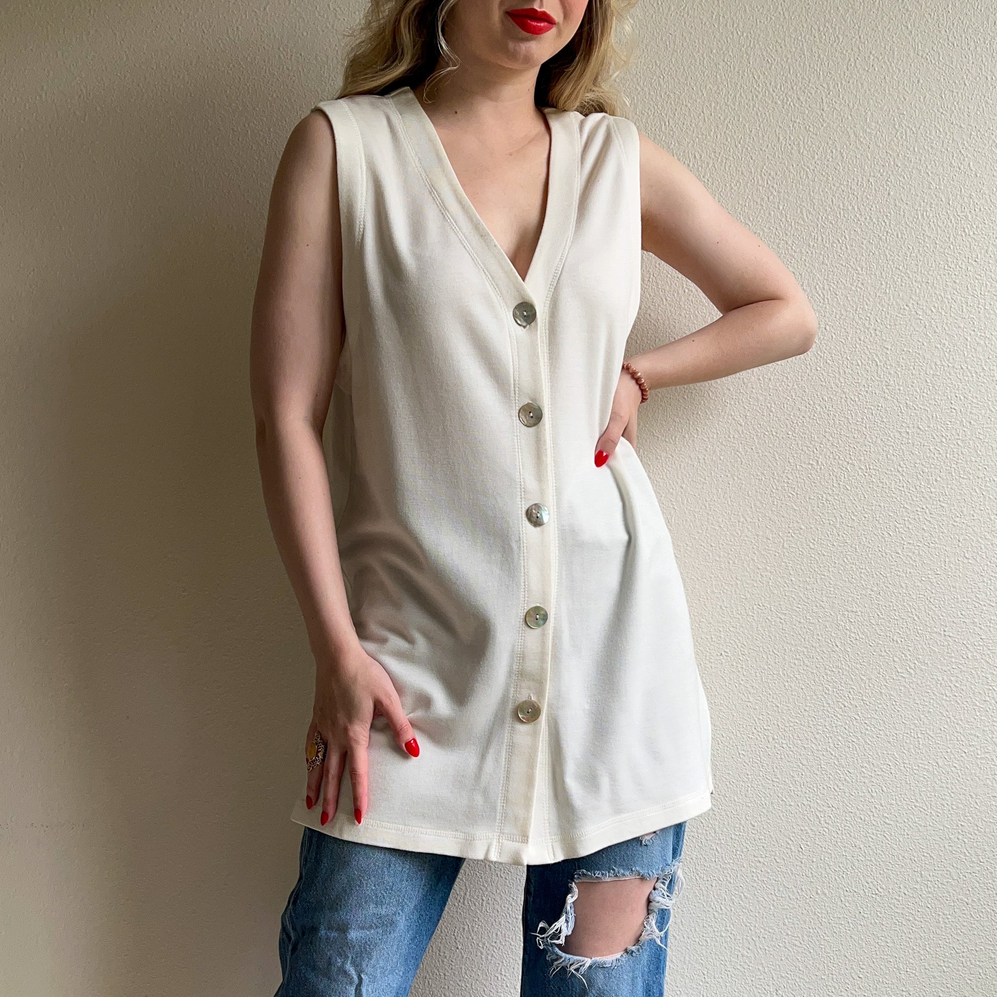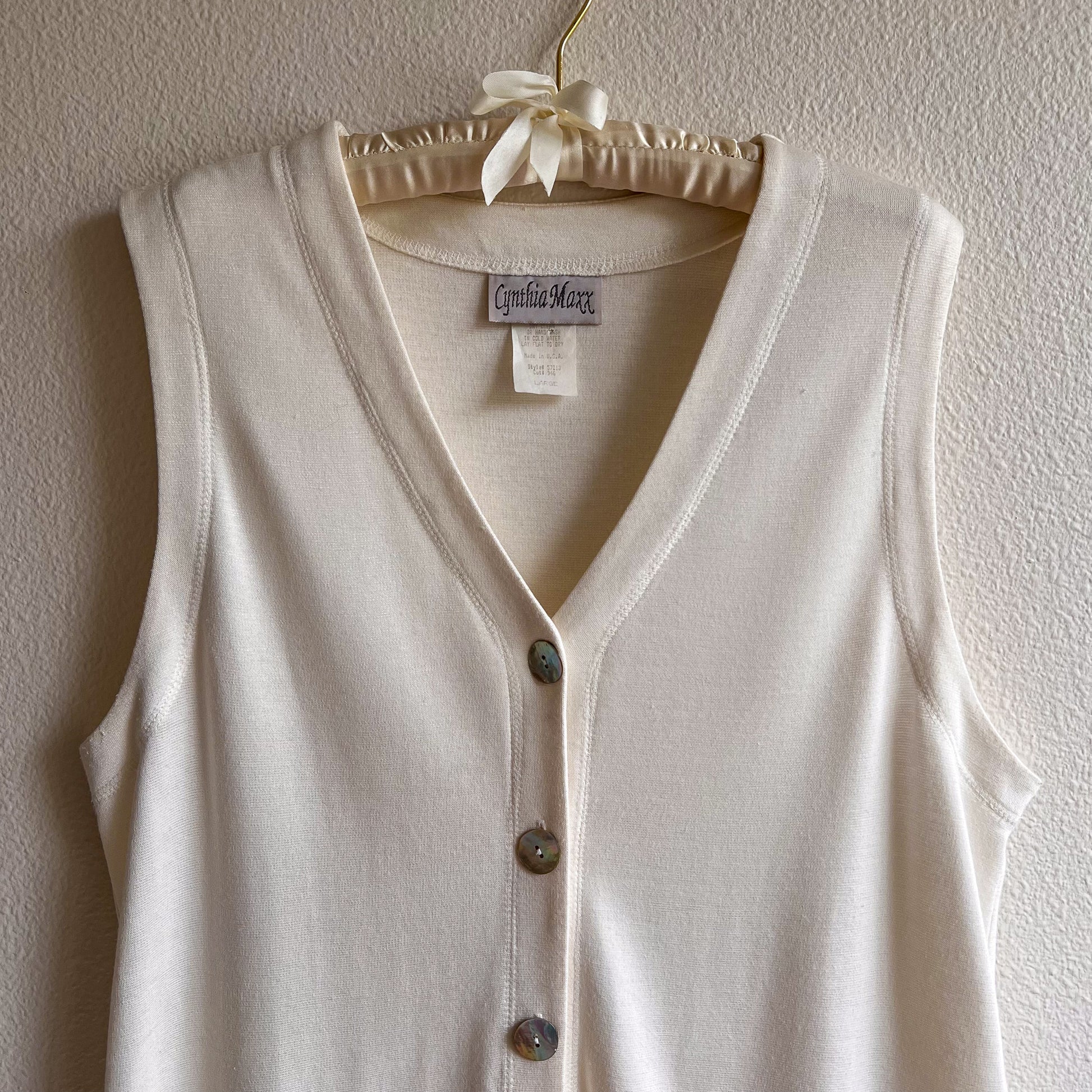 Modern minimal! Vintage sleeveless cardigan features a V-shaped neckline. Fabric is composed of a white knit with large abalone buttons down the front. Two small slits on each side. Sweater is not lined. Light weight. Label is Cynthia Maxx. Made in USA. Good amount of extra stretch. Fabric content is 90% rayon, 5% lycra, and 5% nylon. Cardigan is in excellent condition. Freshly cleaned and ready to wear!