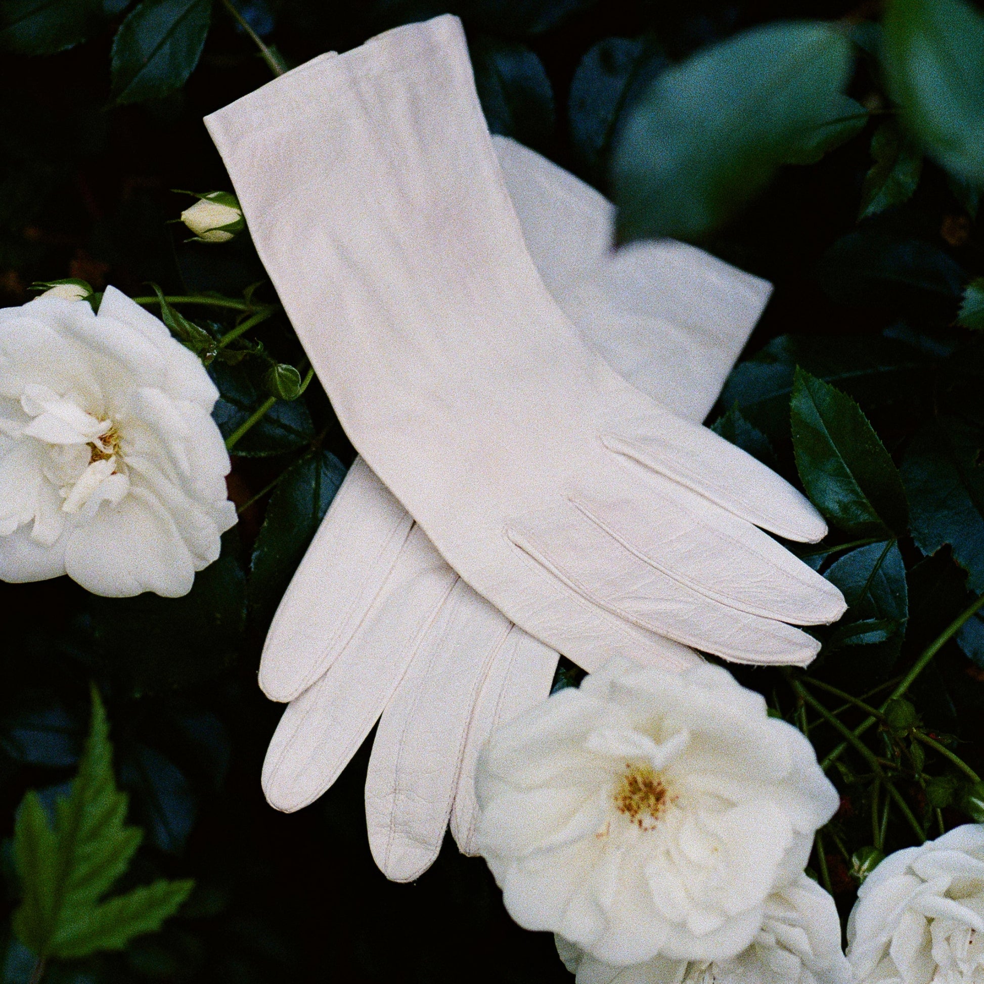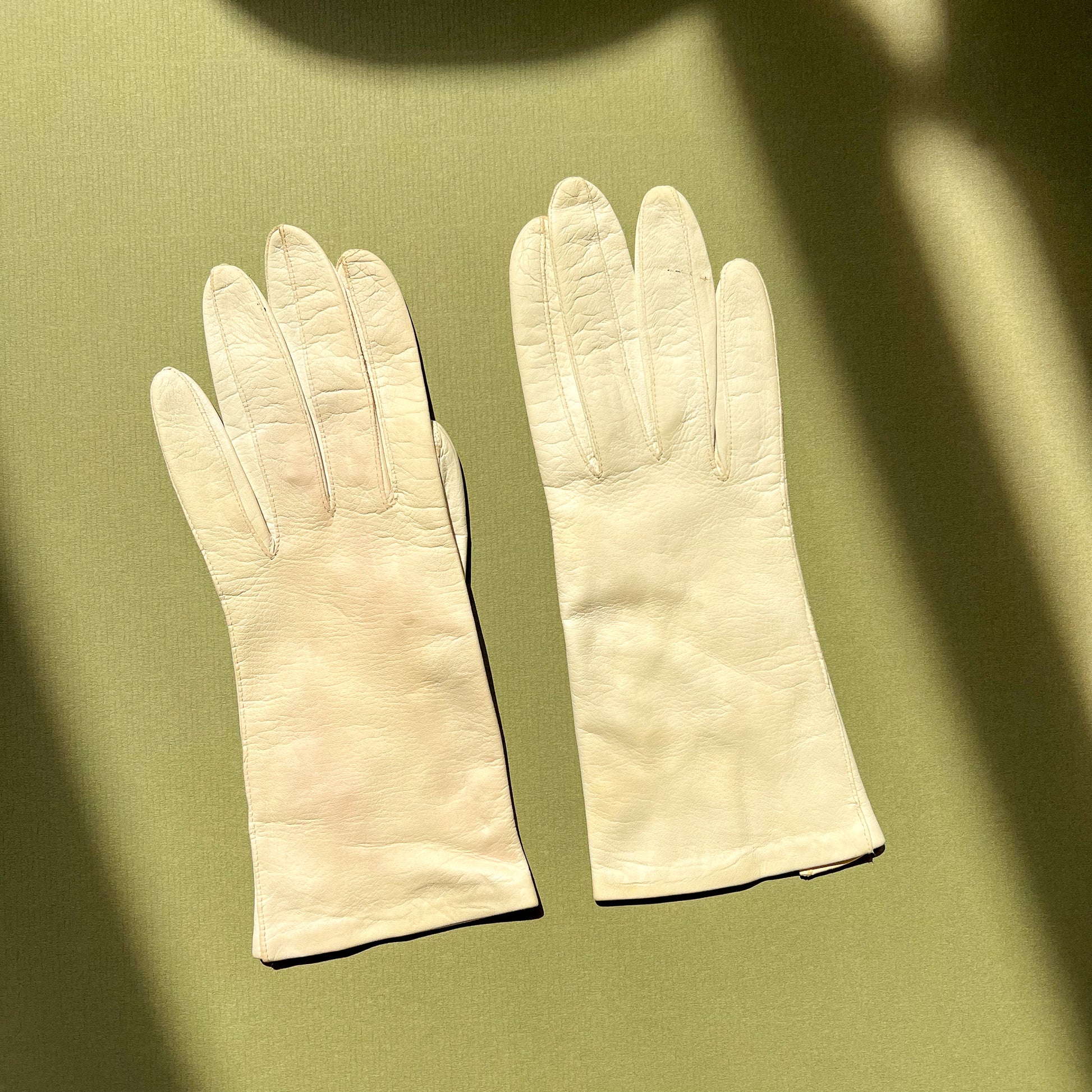 Timeless details! Vintage white kid leather gloves are lined with nylon. Small slit at the opening. Please note: slight marks on the white leather. Please check photos provided. Light weight. Label is Grandoe. Made in Italy. Tiny bit of extra stretch. Fabric content is leather and nylon. Gloves are in great condition. Leather has been freshly cleaned and conditioned!
