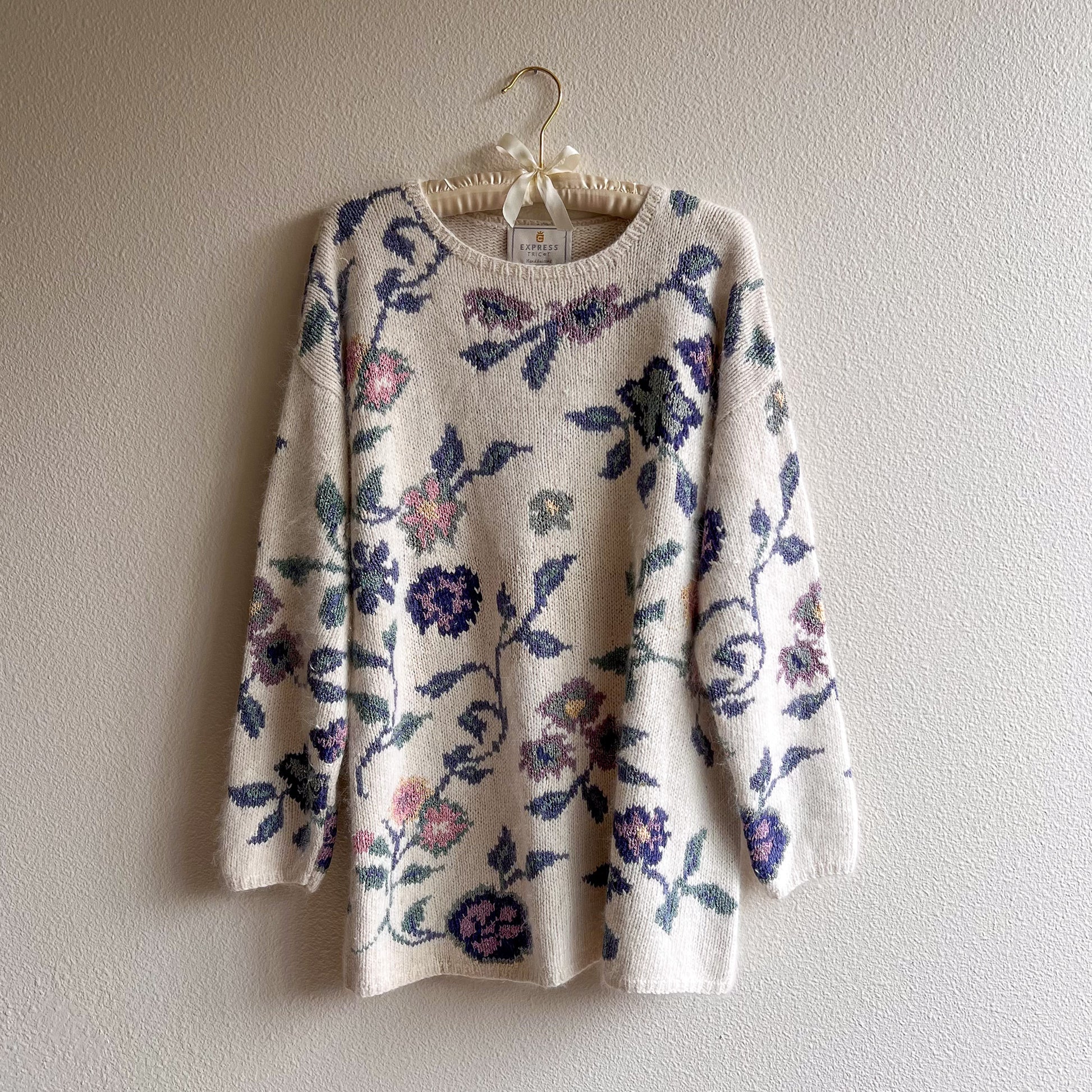 Vintage sweater features a crew neckline with long sleeves. Fabric is composed of a white fuzzy background with a purple and blue floral pattern. Pullover sweater is not lined. Medium weight. Label is Express Tricot Hand Knitted. About an inch of extra stretch. Fabric content is 57% silk, 15% Angora rabbit hair, 14% nylon, 9% rayon, and 5% acrylic. Sweater is in excellent condition. Freshly cleaned and ready to wear!
