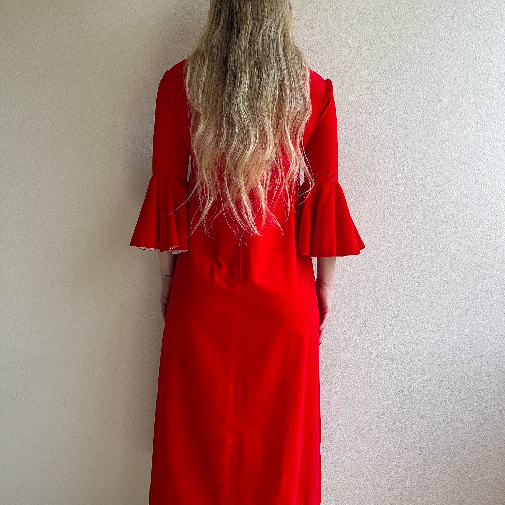 Structure your style! Vintage midi dress features a crew neckline with bell sleeves. Fabric is composed of a bright red velvet with a delightfully fun detail: white cotton eyelet is hidden under the bell sleeve. Shift silhouette. Medium weight. No label. No stretch. Fabric content is made from a synthetic fiber. Dress is in excellent condition. Freshly cleaned and ready to wear!